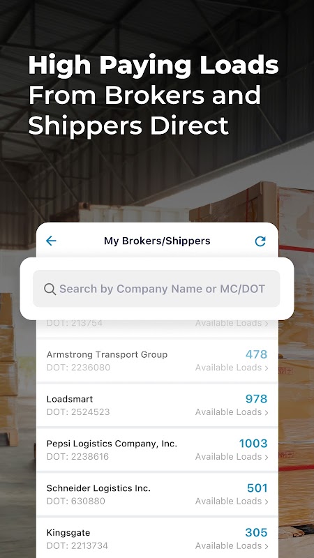 आज ही शामिल हों और सबसे अच्छे ब्रोकरों और शिपर्स से लोड खोजने के लिए एक लोड बोर्ड पर त्वरित पहुंच प्राप्त करें। लोड स्वचालित रूप से ताज़ा हो जाते हैं ताकि आप संयुक्त राज्य भर में नौकरियों को देख सकें। ट्रक-लोड छोटे बेड़े के मालिक-ऑपरेटरों और डिस्पैचरों के लिए एक बढ़िया समाधान है।