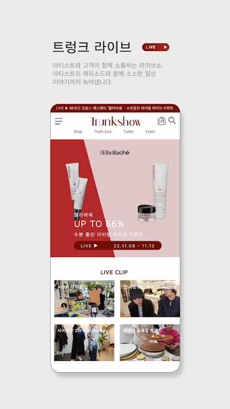 एक मल्टी-शॉपिंग ऐप ट्रंक शो जहां आप फैशन, सौंदर्य, रहन-सहन, इंटीरियर, कला और उपचार यात्राएं सभी एक ही स्थान पर खरीद सकते हैं।