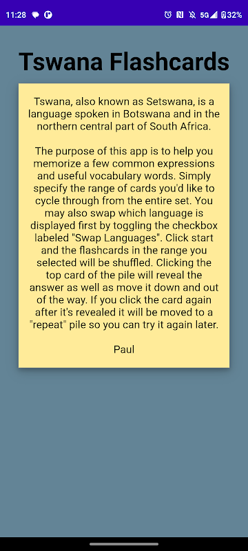 इस ऐप का उद्देश्य आपको त्सवाना भाषा के कुछ सामान्य भावों और उपयोगी शब्दावली को याद करने में मदद करना है। ऐप का उपयोग करने के लिए, बस उन कार्डों की श्रेणी निर्दिष्ट करें जिन्हें आप पूरे सेट में से बदलना चाहते हैं। आप "भाषाएँ बदलें" लेबल वाले चेकबॉक्स को टॉगल करके पहले दिखाई देने वाली भाषा को भी बदल सकते हैं। प्रारंभ पर क्लिक करें और आपके द्वारा चुनी गई श्रेणी के फ़्लैशकार्ड शफ़ल हो जाएँगे। ढेर के सबसे ऊपर वाले कार्ड पर क्लिक करने से उत्तर दिखाई देगा और साथ ही वह नीचे और रास्ते से हट जाएगा। यदि आप कार्ड दिखाई देने के बाद फिर से उस पर क्लिक करते हैं, तो वह "दोहराएँ" ढेर में चला जाएगा ताकि आप बाद में इसे फिर से आज़मा सकें।