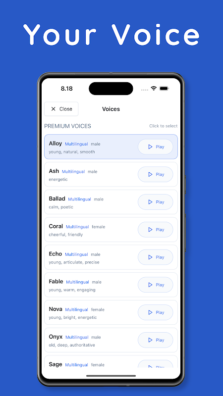 यथार्थवादी AI आवाज़ें: अंग्रेज़ी, स्पेनिश, फ़्रेंच, जर्मन, इतालवी, पुर्तगाली, जापानी, कोरियाई, मंदारिन, अरबी, रूसी, आदि सहित कई भाषाओं में पुरुष और महिला आवाज़ों में से चुनें।