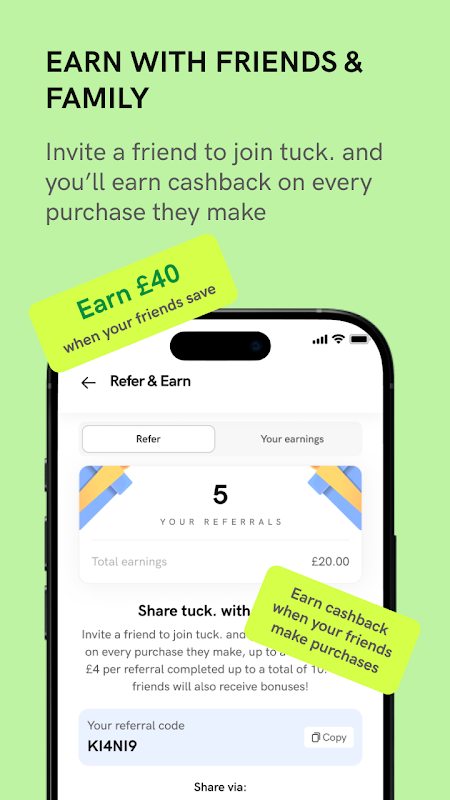 गेमीफाइड कैशबैक रिवॉर्ड्स: • स्क्रैच कार्ड: बोनस कैशबैक और तुरंत रिवॉर्ड जीतें • फ्री सैंपल: टॉप ब्रांड्स के नए प्रोडक्ट्स मुफ्त में ट्राई करें • डेली डील्स: हर दिन नए डिस्काउंट ऑफर और कैशबैक रिवॉर्ड। शॉपिंग कैशबैक को मजेदार बनाएं। किराने और खरीदारी पर पैसे बचाते हुए अतिरिक्त रिवॉर्ड कमाएँ। डिस्काउंट ऑफर या कैशबैक के मौके फिर कभी न चूकें। परिवार और दोस्तों के साथ गिफ्ट कार्ड शेयर करें। अपने प्रियजनों को तुरंत डिस्काउंट गिफ्ट कार्ड भेजें। जन्मदिन, छुट्टियों या किराने के बिल बाँटने के लिए बिल्कुल सही। कैशबैक रिवॉर्ड शेयर करें और दूसरों को पैसे बचाने में मदद करें। हमारे रेफरल प्रोग्राम से कमाएँ। दोस्तों को tuck पर आमंत्रित करें और दोनों रिवॉर्ड कमाएँ! हमारा मज़बूत रेफरल प्रोग्राम आपको तब रिवॉर्ड देता है जब आपके दोस्त पैसे बचाना शुरू करते हैं। 100,000 से ज़्यादा यूज़र्स से जुड़ें जो कैशबैक कमा रहे हैं और दोस्तों को रेफर कर रहे हैं। तुरंत बैंक निकासी। कैशबैक सीधे अपने बैंक खाते में निकालें। अपने शॉपिंग रिवॉर्ड और किराने के कैशबैक जल्दी और आसानी से पाएँ। tuck से पैसे कैसे बचाएँ: 1. tuck डाउनलोड करें। 1. ऐप स्टोर से मुफ़्त डाउनलोड करें। 2. अपने मोबाइल नंबर से कुछ ही सेकंड में साइन अप करें। 4. टेस्को, एस्डा, सेन्सबरी, मॉरिसन और अन्य के लिए रियायती उपहार कार्ड खरीदें। 5. स्टोर में या ऑनलाइन खरीदारी करें। 6. हर खरीदारी पर तुरंत कैशबैक कमाएँ। 7. आसान पहुँच के लिए उपहार कार्ड को Apple वॉलेट में जोड़ें। 8. लॉयल्टी कार्ड एक ही जगह स्टोर करें। 9. अपना पैसा निकालें।