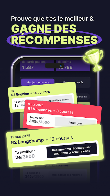 क्विंटे+, टियर्से, क्वार्टे+, पिक5... सभी प्रमुख घुड़दौड़ों पर अपने वर्चुअल दांव लगाएँ और टर्फवन समुदाय को चुनौती दें।