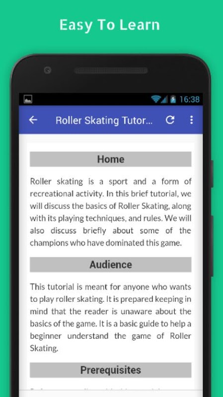 Tutorials for Roller Skating Offline is a complete application for those of you who want to learn Roller Skating easily and for free. There are dozens and even hundreds of Roller Skating tutorials starting to base for beginners to advanced. All these tutorials you can read offline without the need to connect to the internet or mobile data.