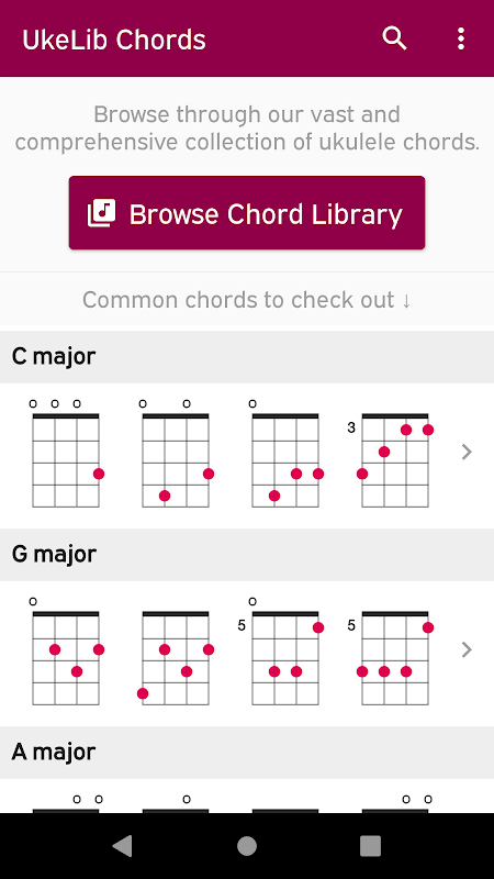 उक्यूलले कॉर्ड लाइब्रेरी में हर कॉर्ड के लिए सुझाए गए फिंगर पोजीशन और ऑडियो हैं।