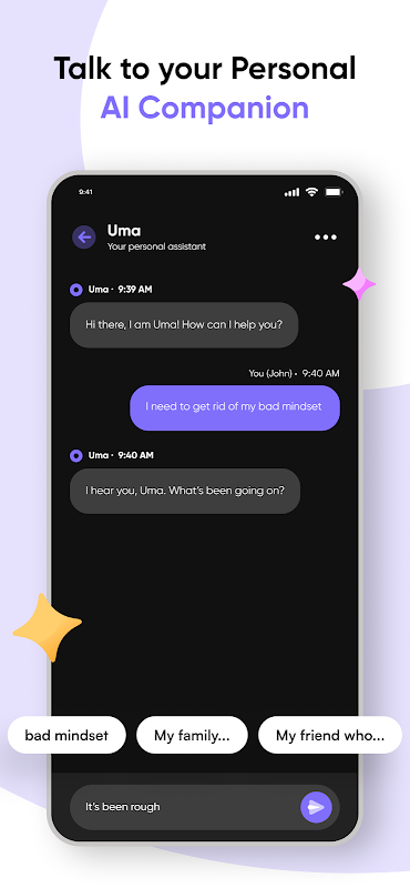 उमा आपकी व्यक्तिगत एआई साथी है, जो जीवन की चुनौतियों से निपटने के लिए सहानुभूतिपूर्ण समर्थन और सहायक मार्गदर्शन प्रदान करती है!