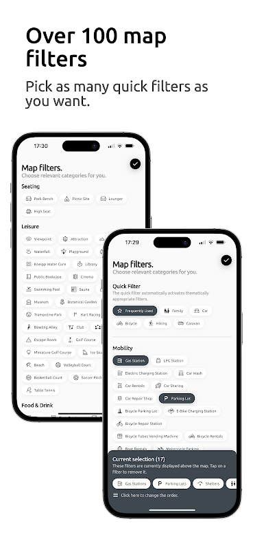 हर उद्देश्य के लिए 100 से ज़्यादा मैप फ़िल्टर - अलग-अलग फ़िल्टर के साथ अपने मैप को कस्टमाइज़ करें और हमेशा वही देखें जो आपको चाहिए। सभी श्रेणियाँ और फ़िल्टर स्पष्ट रूप से व्यवस्थित हैं: