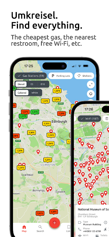 उमक्रेसेल के साथ, अब आपको शौचालय खोजने, ईंधन की कीमतों की तुलना करने, डिफ़िब्रिलेटर के स्थान, पार्किंग स्पॉट फ़ाइंडर, मुफ़्त वाई-फ़ाई मैप, सेकंड-हैंड शॉप और बहुत कुछ के लिए अलग-अलग ऐप की ज़रूरत नहीं है। चलते-फिरते आपको जो कुछ भी चाहिए वह एक ही ऐप में इकट्ठा और आसानी से उपलब्ध है।