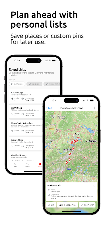 मानचित्र पर अपने खुद के मार्कर सेट करें और अपनी पसंदीदा जगहों को स्पष्ट रूप से व्यवस्थित सूचियों में सहेजें - छुट्टियों, यात्राओं या फ़ोटो स्पॉट के लिए आदर्श। आपकी सूचियाँ सहेजी जाती हैं और आप उन्हें कभी भी एक्सेस कर सकते हैं - ऑफ़लाइन भी।