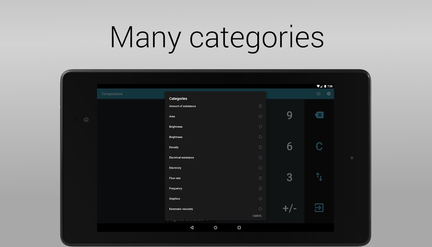 • श्रेणियों की सूची: तापमान, गति, दबाव, काम, मात्रा, वोल्टेज, अंतरण दर, समय, क्षेत्र, ध्वनि, रेडियोधर्मिता, तलीय कोण, शक्ति, ऊर्जा, नंबर सिस्टम, वजन, चुंबकीय प्रेरण, चुंबकीय प्रवाह, चुंबकीय शक्ति क्षेत्र, चमक, प्रकाश व्यवस्था, लंबाई, कीनेमेटीक्स चिपचिपापन, ग्राफिक्स, आवृत्ति, प्रवाह दर, विद्युत प्रतिरोध, बिजली, चिपचिपाहट, घनत्व, आकार डेटा, चमक, पदार्थ की राशि