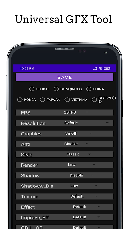 Universal GFX Pro is a utility launcher for specific games where you can fully customize the game graphics to get beautiful pictures and smooth gameplay.