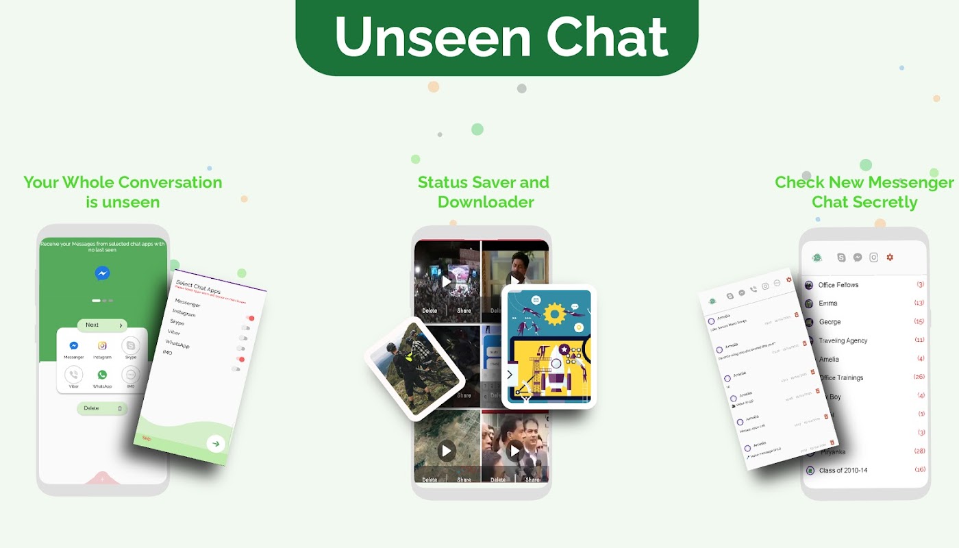 बिना रीड मार्क के संदेश पढ़ें। हटाए गए संदेशों को पुनर्प्राप्त करने के साथ उपयोगकर्ता किसी भी सामाजिक एप्लिकेशन के हटाए गए संदेशों को आसानी से बता सकते हैं। यहां तक कि एक प्रेषक ने एक संदेश भेजा और उसे अचानक हटा दिया, लेकिन आप अभी भी उनके हटाए गए संदेश को बिना जान या उन्हें बताए पढ़ सकते हैं। संदेशों को देखने से बचने या ऐप्स की गोपनीयता सेटिंग बदलने के लिए ऑफ़लाइन मोड को सक्रिय करने की आवश्यकता नहीं है। अनसीन नो लास्ट रीड प्रत्येक चैट ऐप के लिए एक चिकनी डिज़ाइन और स्पष्ट रूप से अलग इंटरफ़ेस प्रदान करता है जहां उपयोगकर्ता संदेशवाहक द्वारा आसानी से संदेशों को एक्सेस कर सकता है।