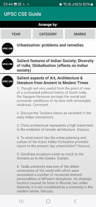 इस ऐप में पिछले वर्ष की मुख्य परीक्षा के प्रश्न क्रमशः वर्ष, विषय और अंकों के अनुसार व्यवस्थित हैं।