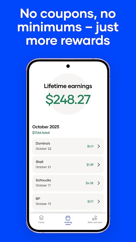 With Upside, you can earn up to 25¢/gal cash back on gas, up to 45% back at restaurants, and up to 30% back at grocery stores. These earnings add up quickly — frequent users earn an average of $290 per year just for adding Upside to their normal routine.