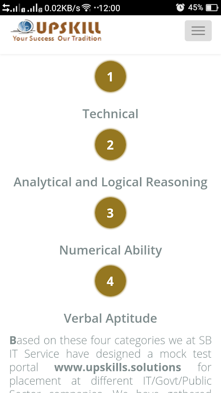 By understating the time factor and busy schedule of students , We at SB IT Service trying to give the handy online solution through our webportal www.upskills.solutions to improve one's aptitude skills. One needs to register on our portal for appearing online mock test series by mean of any media like laptop/computer/mobile etc with internet connectivity.