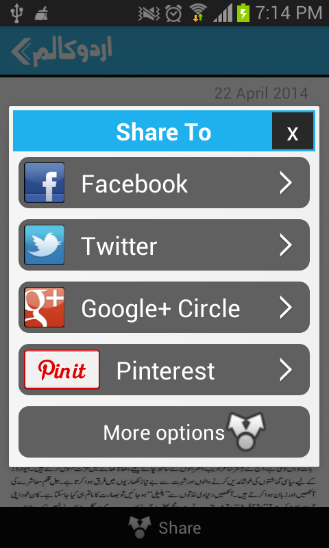 You can share Urdu columns on social networks e.g. Facebook, Twitter, Google+ and many more. Zoom option is also available for better reading.