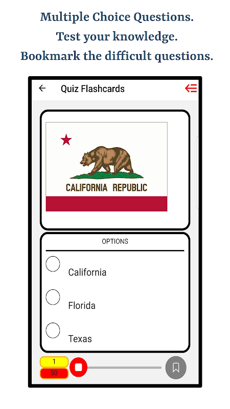 संयुक्त राज्य अमेरिका में 50 राज्य हैं। यह ऐप आपको इन राज्यों के झंडे, नक्शे और राजधानी शहरों को याद रखने में मदद करेगा। उपयोगकर्ता जुड़ाव और उनकी जिज्ञासा जगाने के लिए, यह ऐप flashcards के रूप में बनाया गया है। झंडे अनुभाग के लिए, राज्यों के झंडे फ्लैशकार्ड के एक तरफ दिखाए जाएंगे और राज्यों के नाम फ्लैशकार्ड के दूसरी तरफ दिखाए जाएंगे . इसी तरह राजधानी शहर अनुभाग और मानचित्र अनुभाग के लिए, राज्य का नाम और नक्शा फ्लैशकार्ड के सामने दिखाया जाता है और राजधानी शहर और राज्य का नाम दिखाया जाता है फ्लैशकार्ड के दूसरी तरफ क्रमशः। ऐप की प्रमुख शीर्ष विशेषताएं निम्नलिखित हैं और हम अधिक से अधिक सुविधाओं को जोड़ने के लिए अपनी पूरी कोशिश करते हैं।