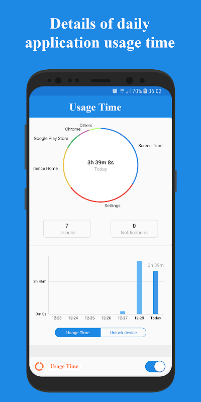 * अपने स्मार्टफोन पर बिताए गए कुल समय को ट्रैक करें जिसमें ऐप उपयोग विवरण, आने वाली सूचनाएं और अनलॉक शामिल हैं।