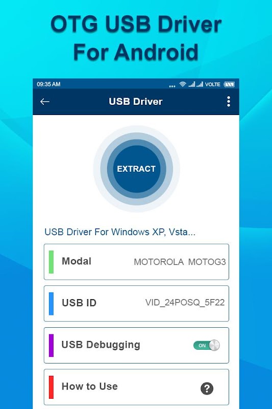USB OTG: USB Driver for Android. Universal Android Phone or Android Tablet Driver for Win XP, Vista, 7, 8, 10 (x86 and x64). Extract adbdriver.zip to your internal storage. You can find it on your computer with USB cable via MTP.