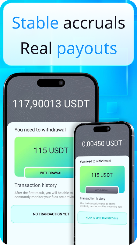 क्लाउड माइनिंग पारंपरिक खनन प्रक्रिया में क्रांति लाती है, जिससे बड़े पैमाने पर ऊर्जा खपत और जटिल हार्डवेयर सेटअप की आवश्यकता समाप्त हो जाती है। हमारे ऐप के साथ, आप हमारे अत्याधुनिक क्लाउड माइनर इंफ्रास्ट्रक्चर तक पहुंच प्राप्त करते हैं, जिससे आप न्यूनतम प्रयास और अधिकतम दक्षता के साथ यूएसडीटी माइन कर सकते हैं।