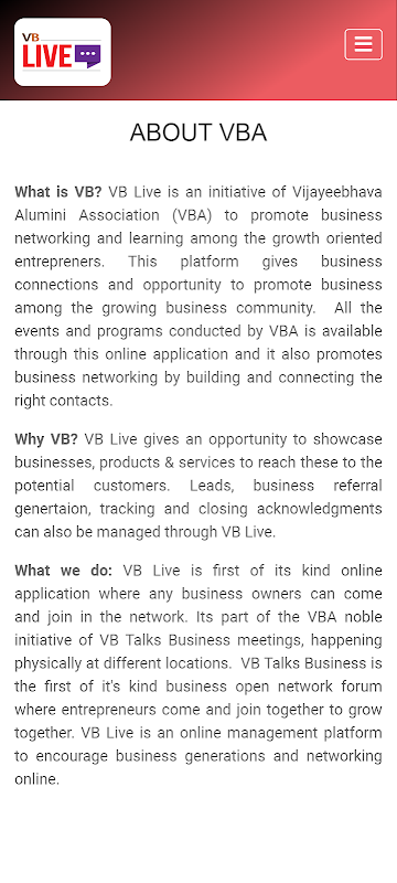 वीबीए द्वारा आयोजित सभी कार्यक्रम और कार्यक्रम इस ऑनलाइन एप्लिकेशन के माध्यम से उपलब्ध हैं और यह सही संपर्कों के निर्माण और कनेक्ट करके व्यावसायिक नेटवर्किंग को भी बढ़ावा देता है।