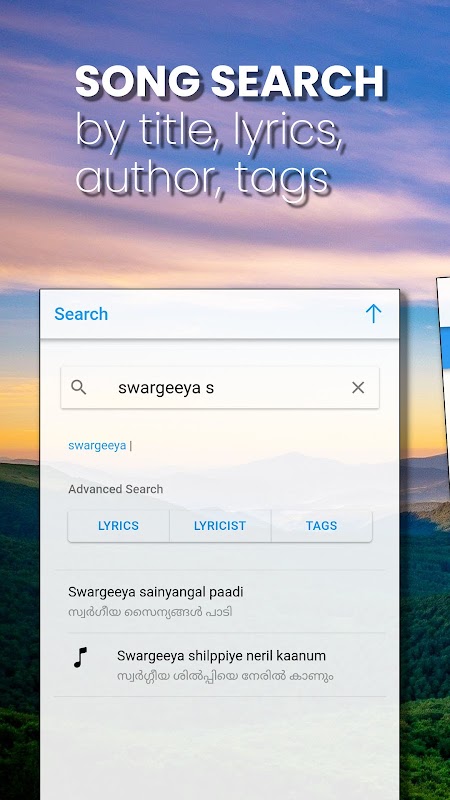 नवीनतम संस्करण में अंग्रेजी लिप्यंतरण और मलयालम में एक गीत के भीतर खोजने के लिए उन्नत सुविधाएं हैं। टैग या गीत के लेखक द्वारा भी खोजें।