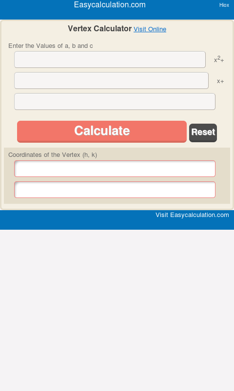 वर्टेक्स कैलक्यूलेटर एक द्विघात समीकरण के शीर्ष गणना करने के लिए
