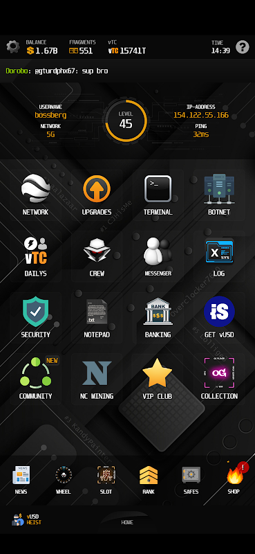 - दैनिक मिशन: मूल्यवान पुरस्कारों के लिए दैनिक मिशन पूरे करें, vUSD डकैती से लेकर पासवर्ड क्रैकिंग और लक्ष्य शोषण तक। उन खिलाड़ियों के लिए बिल्कुल सही है जो उच्च-दांव हैक और स्थिर प्रगति का आनंद लेते हैं।