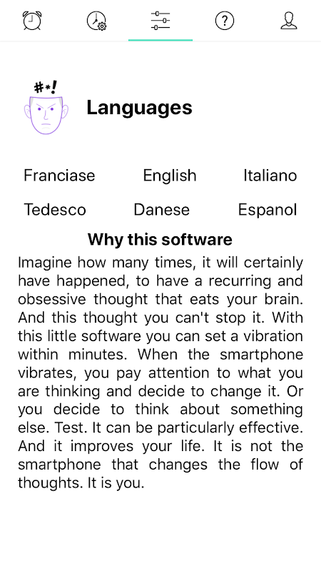 कल्पना कीजिए कि कितनी बार, यह निश्चित रूप से हुआ होगा, एक आवर्ती और जुनूनी विचार है कि आपको परेशान करता है। और यह सोचा कि आप इसे रोक नहीं सकते। इस छोटे से सॉफ्टवेयर से आप अलग से एक वाइब्रेशन मिनट सेट कर सकते हैं। जब स्मार्टफोन कंपन करता है, तो आप उस पर ध्यान देते हैं जो आप सोच रहे हैं और इसे बदलने का फैसला करते हैं। या आप कुछ और सोचने का फैसला करते हैं। परीक्षा। यह विशेष रूप से प्रभावी हो सकता है। और यह आपके जीवन को बेहतर बनाता है। यह स्मार्टफोन नहीं है जो विचारों के प्रवाह को बदलता है। आप ही हैं।