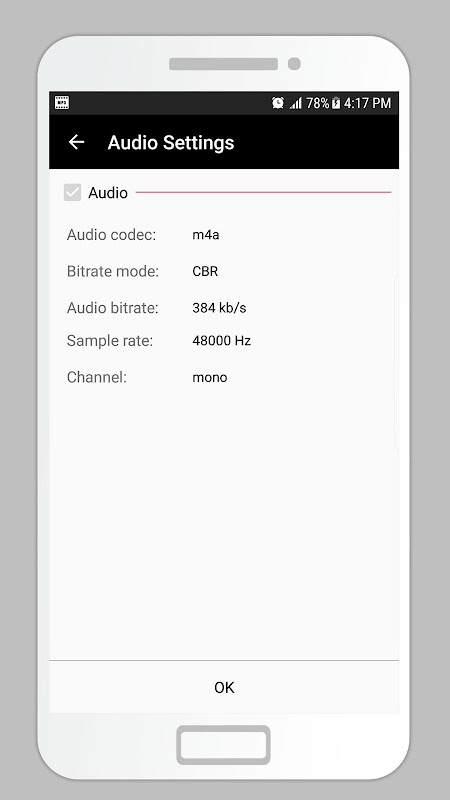 आउटपुट ऑडियो फ़ाइल को कई प्रारूपों m4a, mp3, ogg, wav, 3gp, flac, amr में सहेजा जा सकता है। आप अपनी इच्छित ऑडियो सेटिंग्स जैसे बिट-रेट, नमूना दर, चैनल और बहुत कुछ चुन सकते हैं।