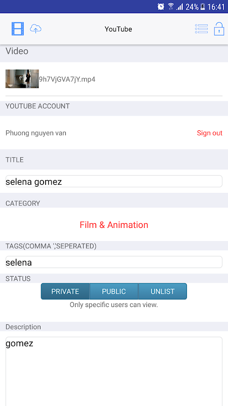 * Notice : If this is the first time for you to upload a video to YouTube, you MUST create a channel in YouTube before using the app.