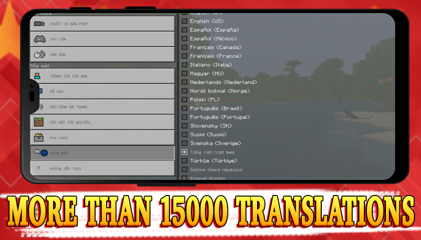 Minecraft Pocket Edition के लिए बढ़िया अतिरिक्त वियतनामी भाषा में आपका स्वागत है। यदि आप वियतनामी हैं और अच्छी तरह से अंग्रेजी नहीं जानते हैं, तो यह मॉड विशेष रूप से आपके लिए है। यहां आपको एमसीपीई के लिए एक अच्छा मुफ्त ऐडऑन मिलेगा जो आपको अधिक अनुभव प्राप्त करने और अपना जीयूआई बदलने में मदद करेगा। यदि आप अंग्रेजी नहीं समझते हैं, तो चिंता न करें, यह समय इन ओपन वर्ल्ड सर्वाइवल मॉड्स को स्थापित करने का है!