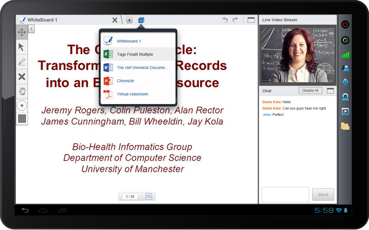 ऑनलाइन, सिखाने या सीखने के लिए, Android गोली पर वर्चुअल क्लासरूम एप्लिकेशन का प्रयोग करें.