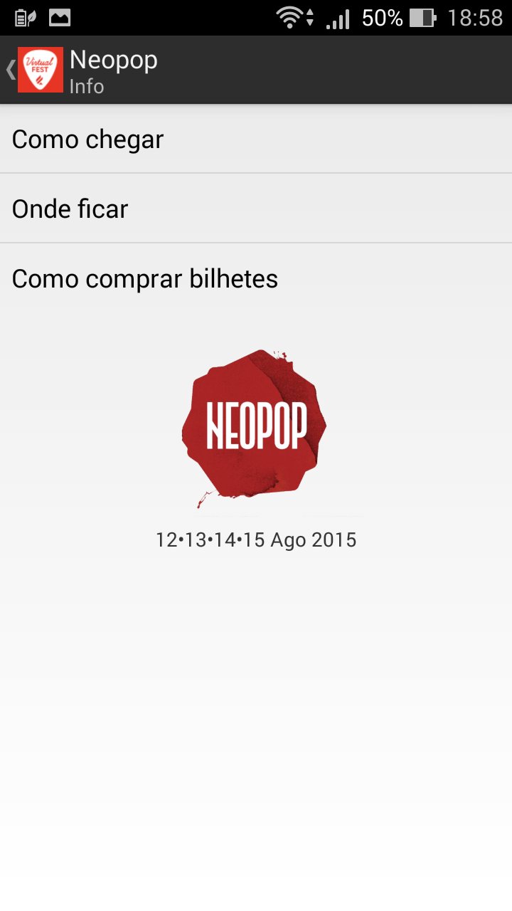 Recebe informação atualizada sobre novas confirmações e usa o Virtual Fest como um guia com informação sobre horários e palcos de todos os festivais, como comprar bilhetes, onde ficar e como chegar.