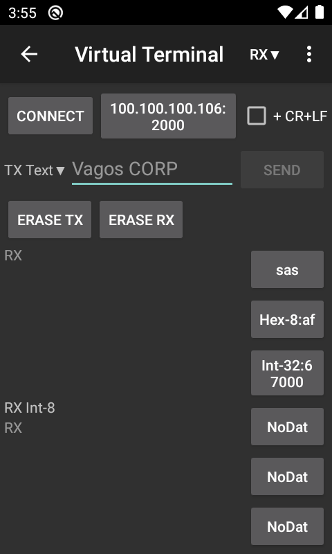 • बाइट्स प्राप्त करें और उन्हें 'दोहरी RX' के साथ एक ही समय में वर्ण और पूर्णांक के रूप में दिखाएं