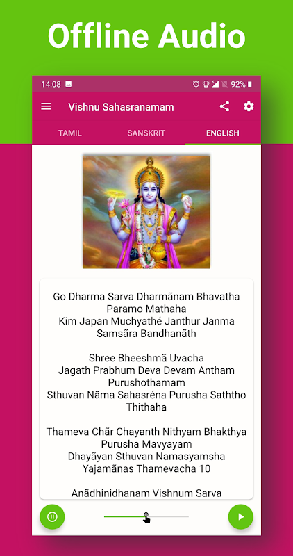 इस एप्लिकेशन के माध्यम से श्री विष्णु सहस्रनाम पढ़ें और सुनें।
