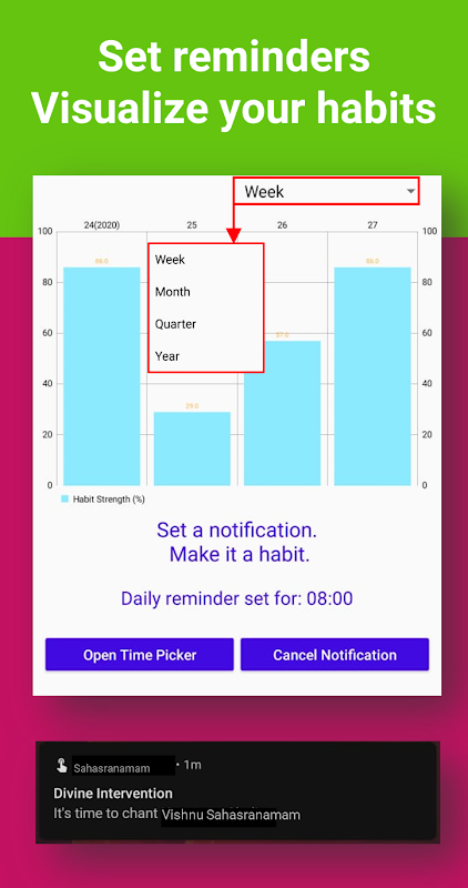 Remind आप रिमाइंडर सेट कर सकते हैं और अपने दैनिक जप की आदतों पर भी नज़र रख सकते हैं। आदत चार्ट आपको चेन को न तोड़ने के लिए प्रेरित करता है और आपको बिना असफल हुए श्लोकों का जाप करने में मदद करता है।