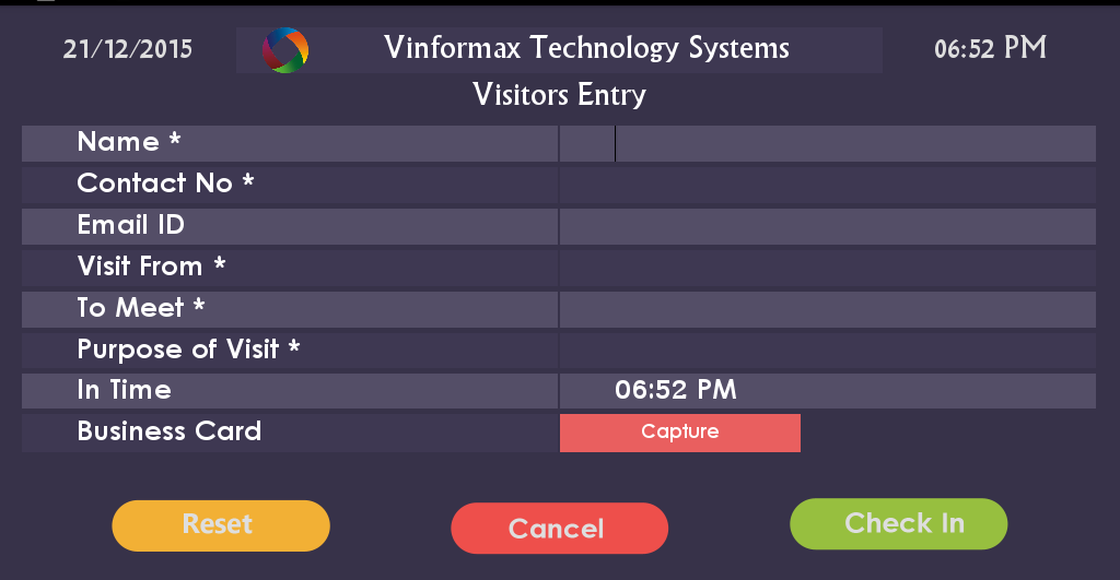 - Capturing the Business card photo of Visitors coming with Business cards or Visitors photo if they don't have business card