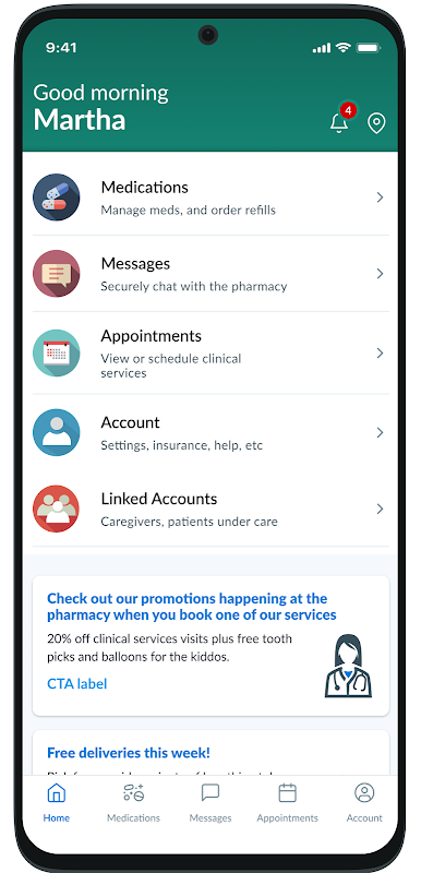 अपॉइंटमेंट शेड्यूल करें: टीकाकरण या अन्य फार्मेसी सेवाओं की आवश्यकता है? आपके लिए सुविधाजनक समय पर हमारे ऐप के माध्यम से अपॉइंटमेंट शेड्यूल करें। इन नियुक्तियों को अपने कैलेंडर में सिंक करें और यह सुनिश्चित करने के लिए अनुस्मारक प्राप्त करें कि आप अपनी स्वास्थ्य देखभाल के प्रबंधन में शीर्ष पर बने रहें।