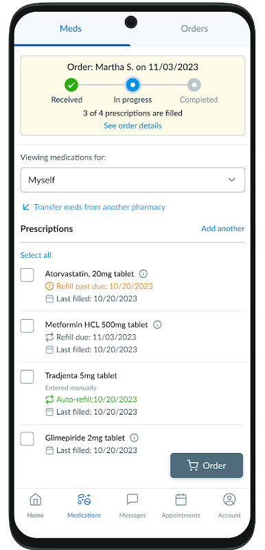 दवा रिफिल प्रबंधित करें: रिफिल अनुरोध सबमिट करें, पिकअप/रीफिल अनुस्मारक प्राप्त करें, और कुछ ही क्लिक के साथ अपना ऑर्डर इतिहास देखें।