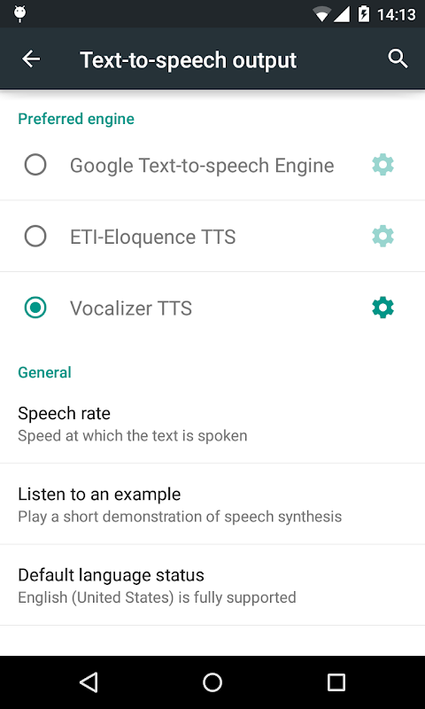 एक बार आपके उपकरण पर इस एप्लिकेशन के इन्स्टॉल होने पर, आप सेटिंग> भाषा और इनपुट> टेक्स्ट-टू-स्पीच आउटपुट पर जाकर और “वोकलाइज़र टीटीएस” को डिफ़ॉल्ट इंजन चुन कर आप वोकलाइज़र को अपना डिफ़ॉल्ट टेक्स्ट-टू-स्पीच इंजन बना सकते हैं।