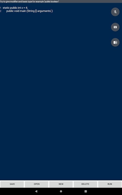 ऐप उपयोगकर्ता को वॉइस कमांड के साथ जावा कोड इनपुट करने और इसे संकलित और चलाने की अनुमति देता है।