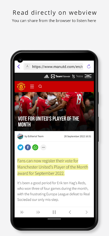 - Go to your phone's browser to search for a website -> click share -> click on the Voice Reader icon, the app will jump into the web browsing section on the app and you can listen to it here.