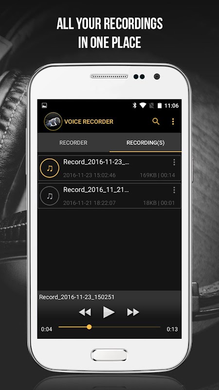 ► रिकॉर्डिंग है कि आप save- उपयोगकर्ता सभी सहेजे आवाज रिकॉर्डिंग की सूची ब्राउज़ कर सकते हैं। आप खेल सकते हैं, ठहराव, आगे / चाल पिछड़े, या एप्लिकेशन इंटरफ़ेस से ही रिकॉर्डिंग को हटा दें।
