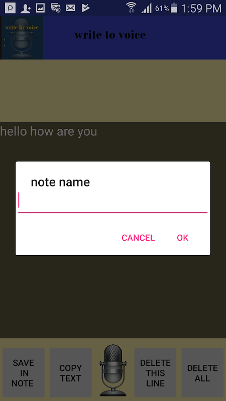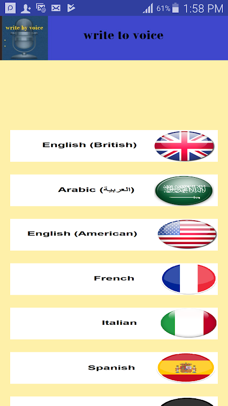 write a big test by your voice line by line and you can make note saved in your mobile or copy your text .. using more than 20 Languages (american - اللغة العربية -britich - francese - Lingua italiana - Spanisch- deutsche Sprache - 中文 - 日本語 - Portugues - canada - Русский язык - हिंदी भाषा - Türkçe ) you can delete line by line or delete all if you want .. now you can write a big letter to any one without fingers
