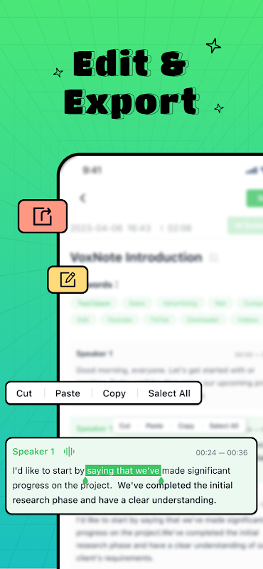 👉 लिप्यंतरित सामग्री के संपादन का समर्थन करें, और साझा या निर्यात करें।