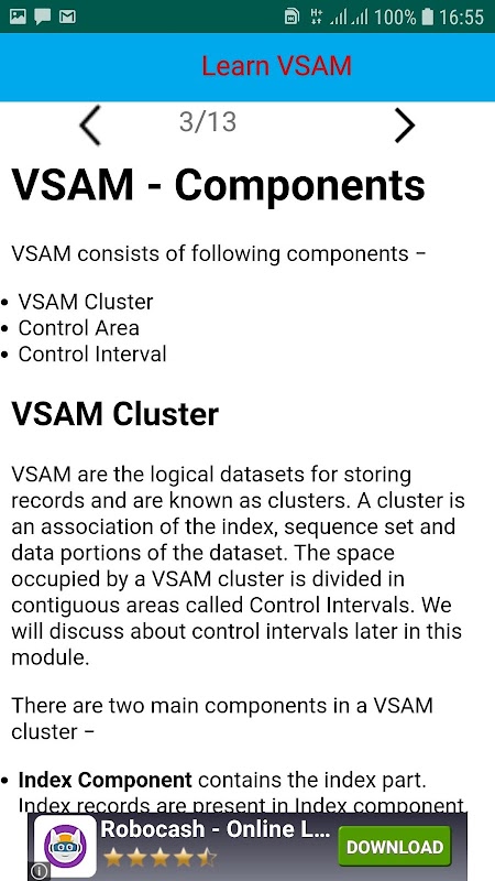 VSAM stands for Virtual Storage Access Method. VSAM is a file storage access method used in MVS, ZOS and OS/390 operating systems. It was introduced by IBM in 1970's. It is a high performance access method used to organize data in form of files in Mainframes. VSAM is used by COBOL and CICS in Mainframes to store and retrieve data. VSAM makes it easier for application programs to execute an input-output operation.