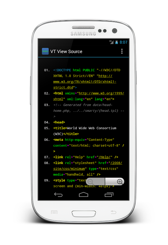 स्रोत कोड यूआरएल पता लिखकर या डिवाइस ब्राउज़र (देशी एंड्रॉयड ब्राउज़र, ओपेरा मोबाइल, डॉल्फिन, क्रोम, फायरफॉक्स, आदि) के "शेयर पेज" कार्यक्षमता का उपयोग करके खोला जा सकता है।