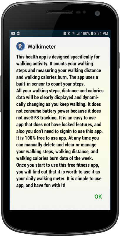 यह फिटनेस ऐप विशेष रूप से चलने की गतिविधि के लिए डिज़ाइन किया गया है। यह आपके चलने के चरणों को गिनता है और आपके चलने की दूरी और चलने वाली कैलोरी को मापता है। एप्लिकेशन आपके चरणों की गणना करने के लिए एक अंतर्निहित सेंसर का उपयोग करता है। आपके सभी चलने के चरण, दूरी और कैलोरी डेटा स्पष्ट रूप से प्रदर्शित और गतिशील रूप से बदलते रहेंगे जैसे आप चलते रहते हैं। यह बैटरी पावर का उपभोग नहीं करता है क्योंकि यह जीपीएस ट्रैकिंग का उपयोग नहीं करता है। यह ऐप का उपयोग करना आसान है जिसमें लॉक फीचर नहीं हैं, और इस ऐप का उपयोग करने के लिए आपको साइन इन करने की भी आवश्यकता नहीं है। यह ऐप का उपयोग करने के लिए 100% मुफ़्त है। किसी भी समय आप मैन्युअल रूप से हटा सकते हैं और अपने चलने के चरणों, पैदल दूरी, और चलने वाली कैलोरी को हटा सकते हैं और सप्ताह का डेटा जला सकते हैं। एक बार जब आप इस मुफ्त फिटनेस ऐप का उपयोग करना शुरू करते हैं, तो आपको पता चलेगा कि यह आपके दैनिक चलने वाले मीटर के रूप में उपयोग करने के लिए लायक है। एप्लिकेशन का उपयोग करना सरल है, और इसके साथ मज़े करो!