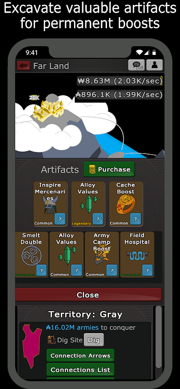 ★ खुदाई स्थल खोजें और कलाकृतियों के लिए खुदाई शुरू करें, जो आपके साम्राज्य को ईंधन देने के लिए स्थायी उन्नयन हैं। उन कलाकृतियों का त्याग करके उन्हें अपग्रेड किया जा सकता है जिनकी आपको आवश्यकता नहीं है।