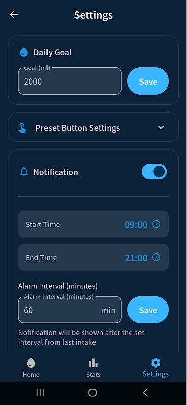 - उपयोगकर्ता द्वारा निर्धारित अंतरालों के आधार पर पानी पीने के रिमाइंडर